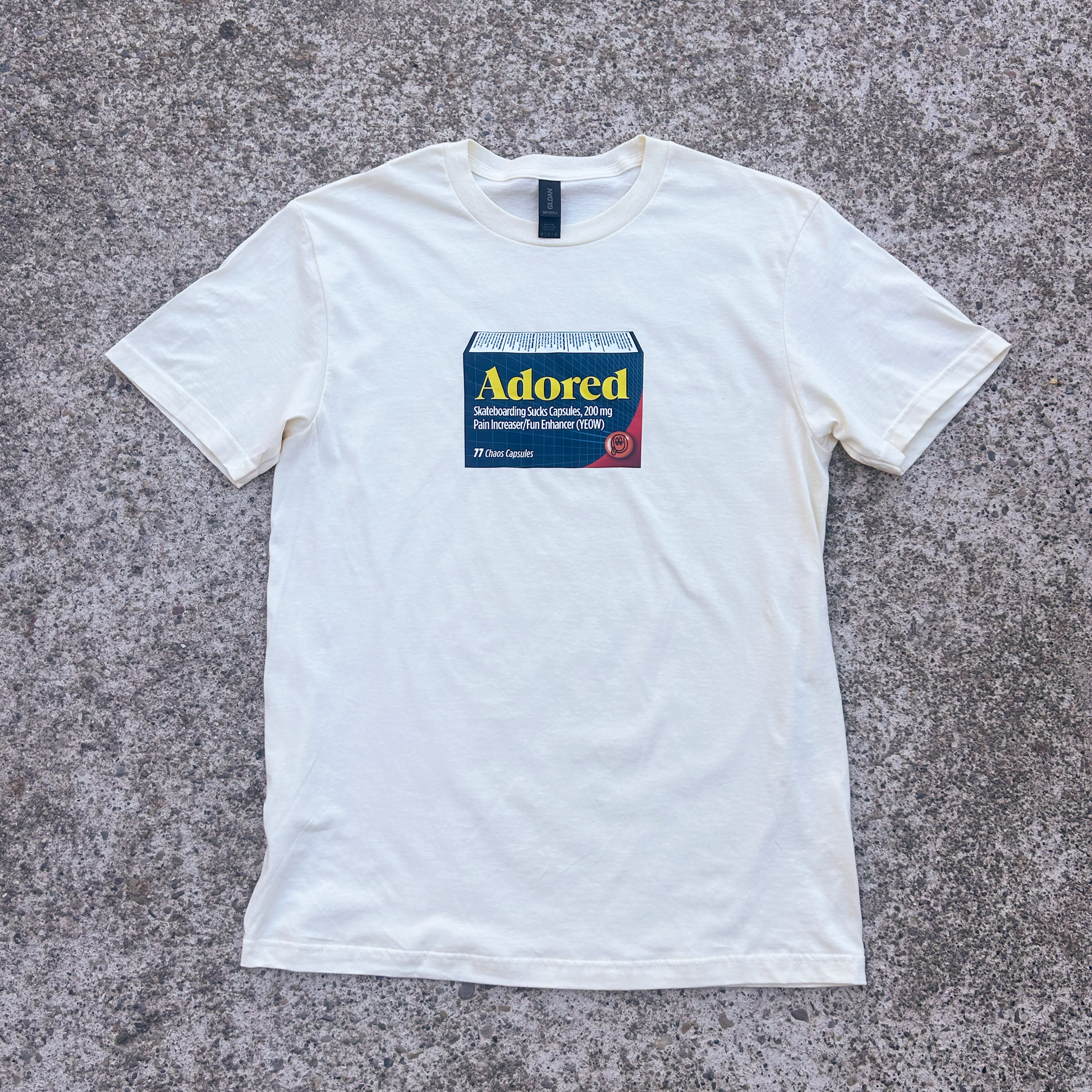 This shirt was a concept by my friend Rudd. We have been skating with each other since 1994 and he is exactly what ADORED is about. Some dude getting out after work and skating whenever he can. Rachel designed it. Printed in Walnut Creek using DTF